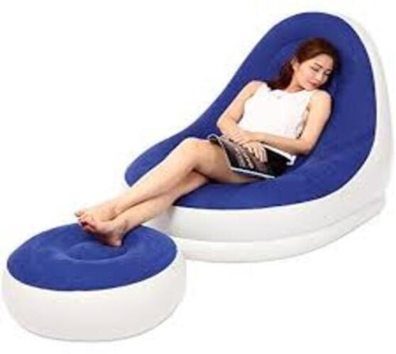A versatile inflatable sofa that doubles as a bed. Features a soft flocked top for comfort, durable PVC base, and includes a matching footstool. Lightweight and portable, it’s perfect for indoor or outdoor use, easy to inflate/deflate with a pump, and ideal for lounging, napping, or camping. Supports one to two people depending on model; folds for convenient storage.