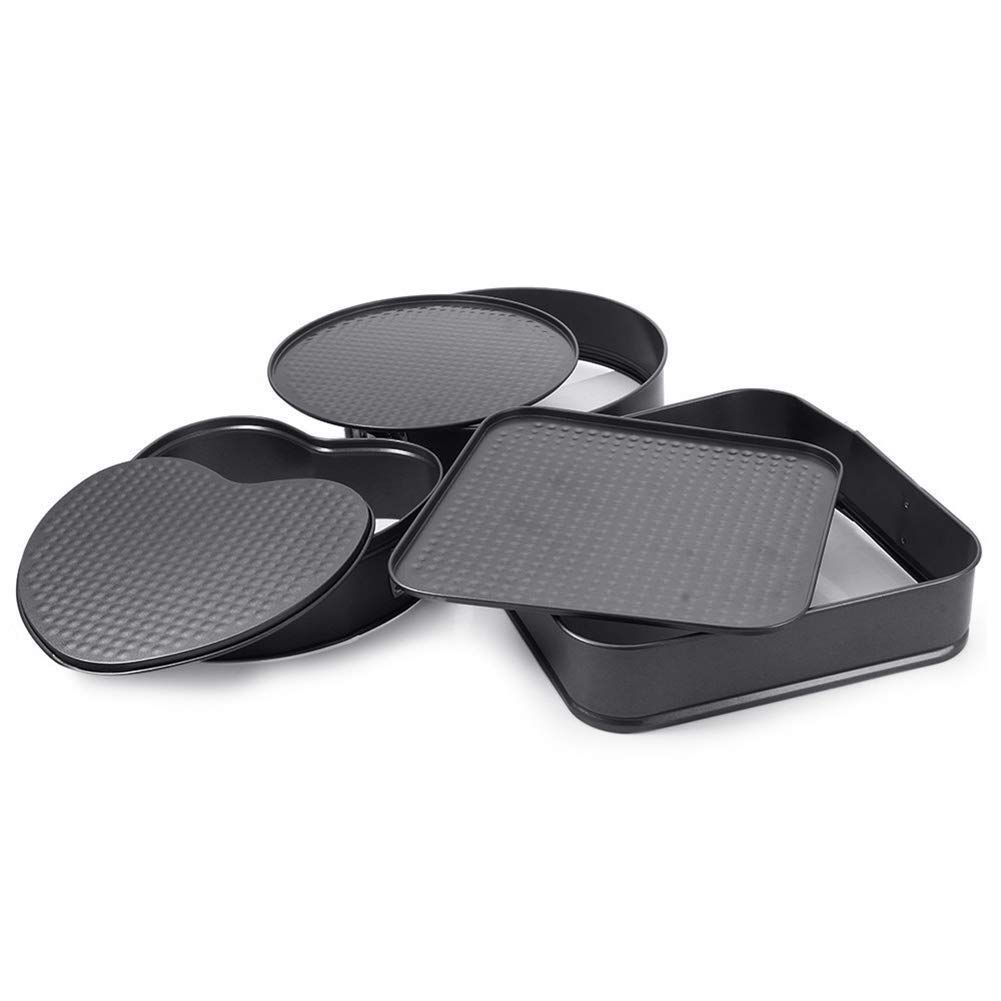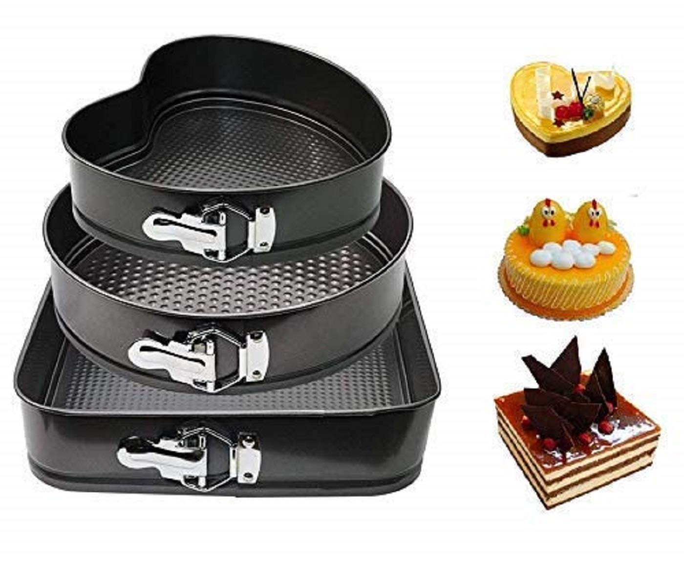 - This cake baking pan set that comes with 3 piece non-stick cake pans in different shapes (heart shape, round shape, square shape), which allows your make different shaped cakes as you need. Ideal for all types of cakes, such as pies, cheesecake, desserts, ice cream cake and so on.