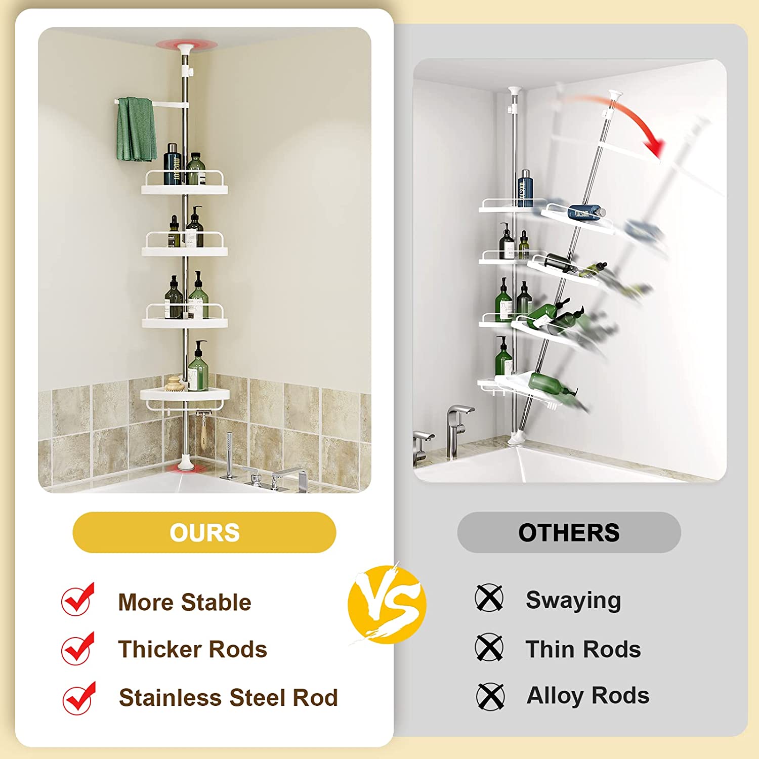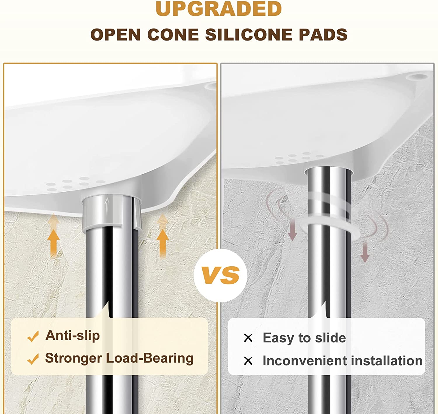 MORE STABLE AND SAFE: Our non-slip silicone ring designed by an upgraded tapered-shape, which can effectively prevent the shelf from slipping off and keep the tray in place stronger. The strong powerful tension spring inside the standing shower caddy make it contacted with the ceiling and floor tightly without shaking or falling down