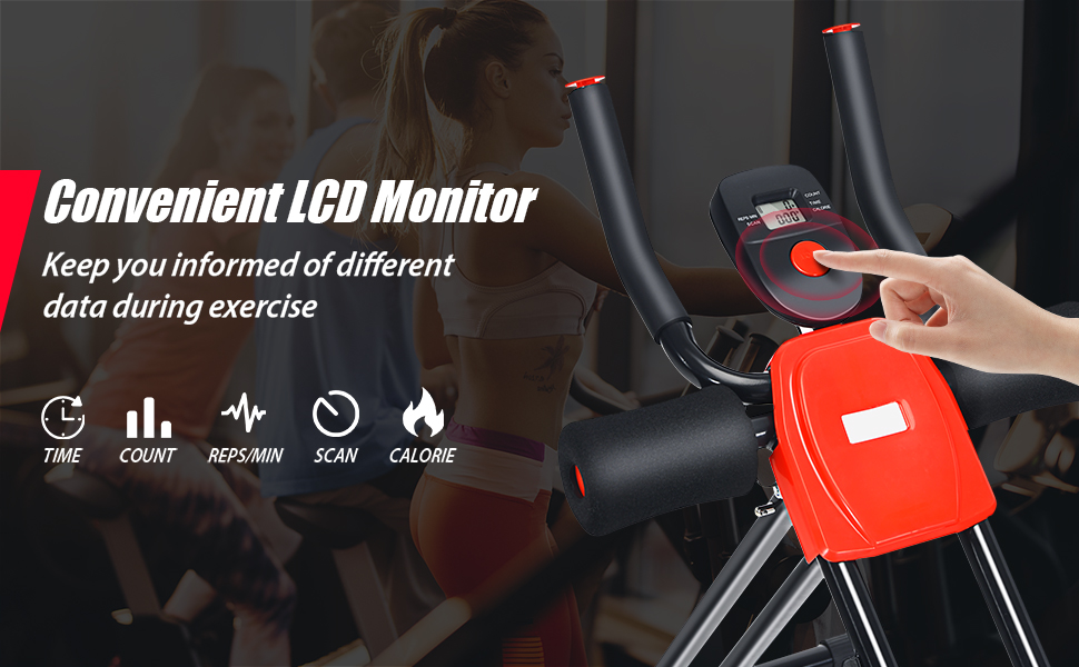 - 【Smart LCD Monitor】 Foldable Core Abdominal Trainer is equipped with a LCD monitor display to show your REPS, COUNT, TIME and CALORIE, let you know your real-time condition better and make more scientific plans. You can change the mode by one gentle press and preset by long press.